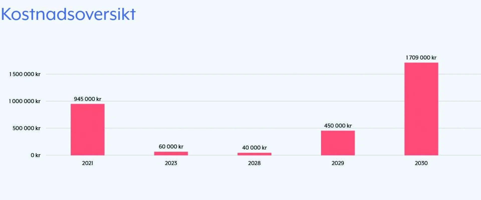 Med vedlikeholdspostene fordelt på riktig år, lages det søylediagram som tydelig viser vedlikeholdskostnadene hvert år framover. Dette er grunnlaget for de årlige vedlikeholdskostnadene i boligselskapet.